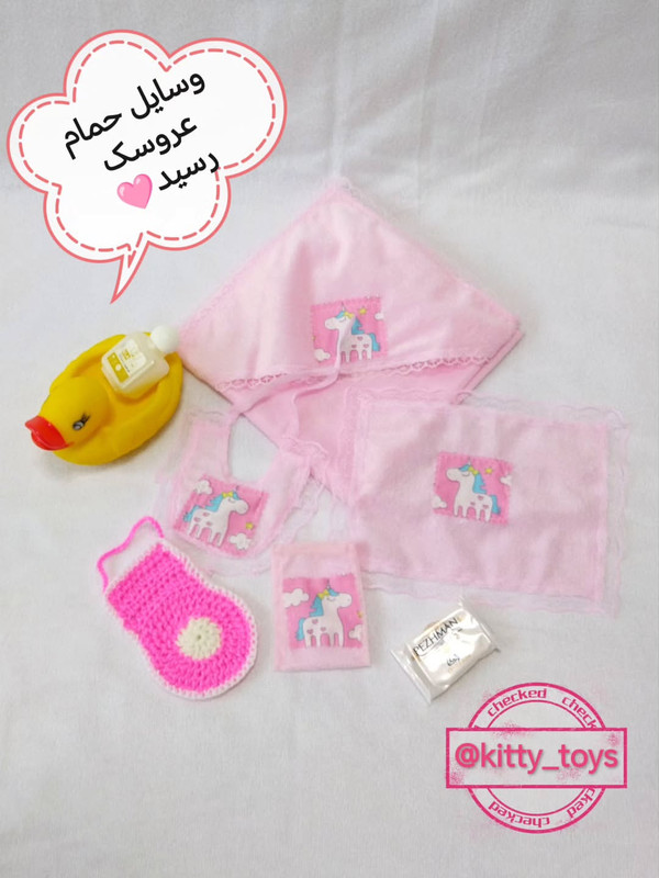 اقلام همراه: حوله بزرگ، حوله صورت، لیف بافت، لیف پارچهای، صابون، شامپو، اردک، پیشبند