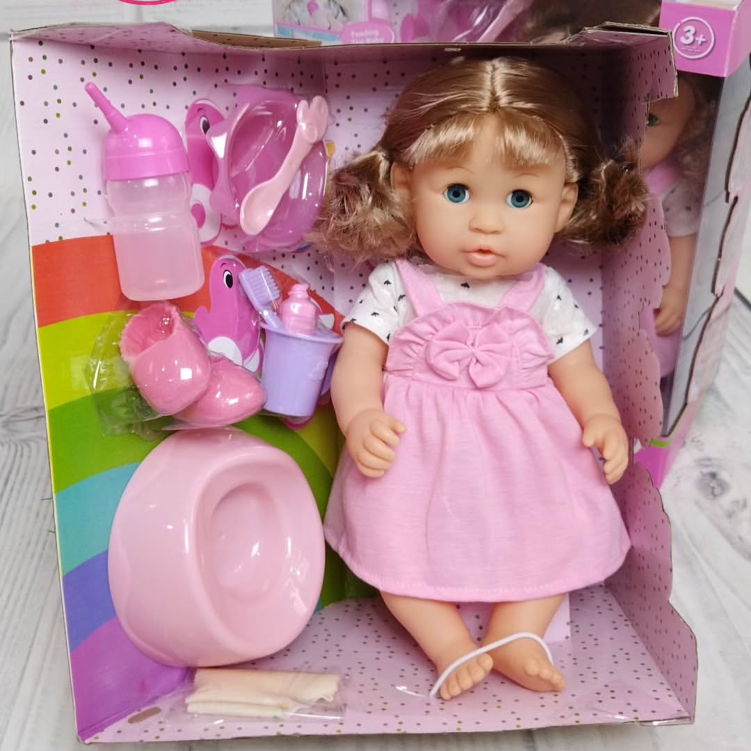 جنس صورت و دست و پا گوشتی و جنس بدن پلاستیک درجه یک است. این عروسک موزیکال بوده، چشم خواب و بیدار و موهای کاشته شده دارد. دارای وسایلی مطابق عکس است. هم چنین دارای جعبه زیبای کادویی نیز میباشد