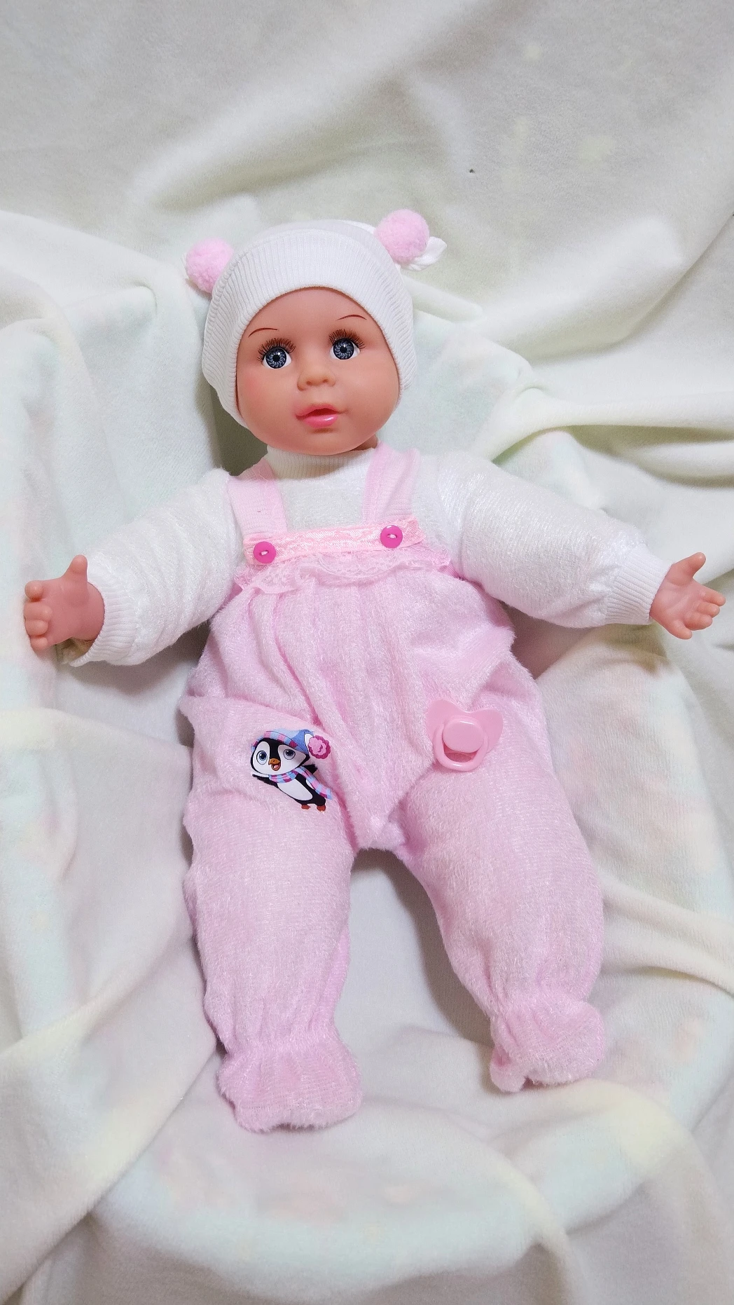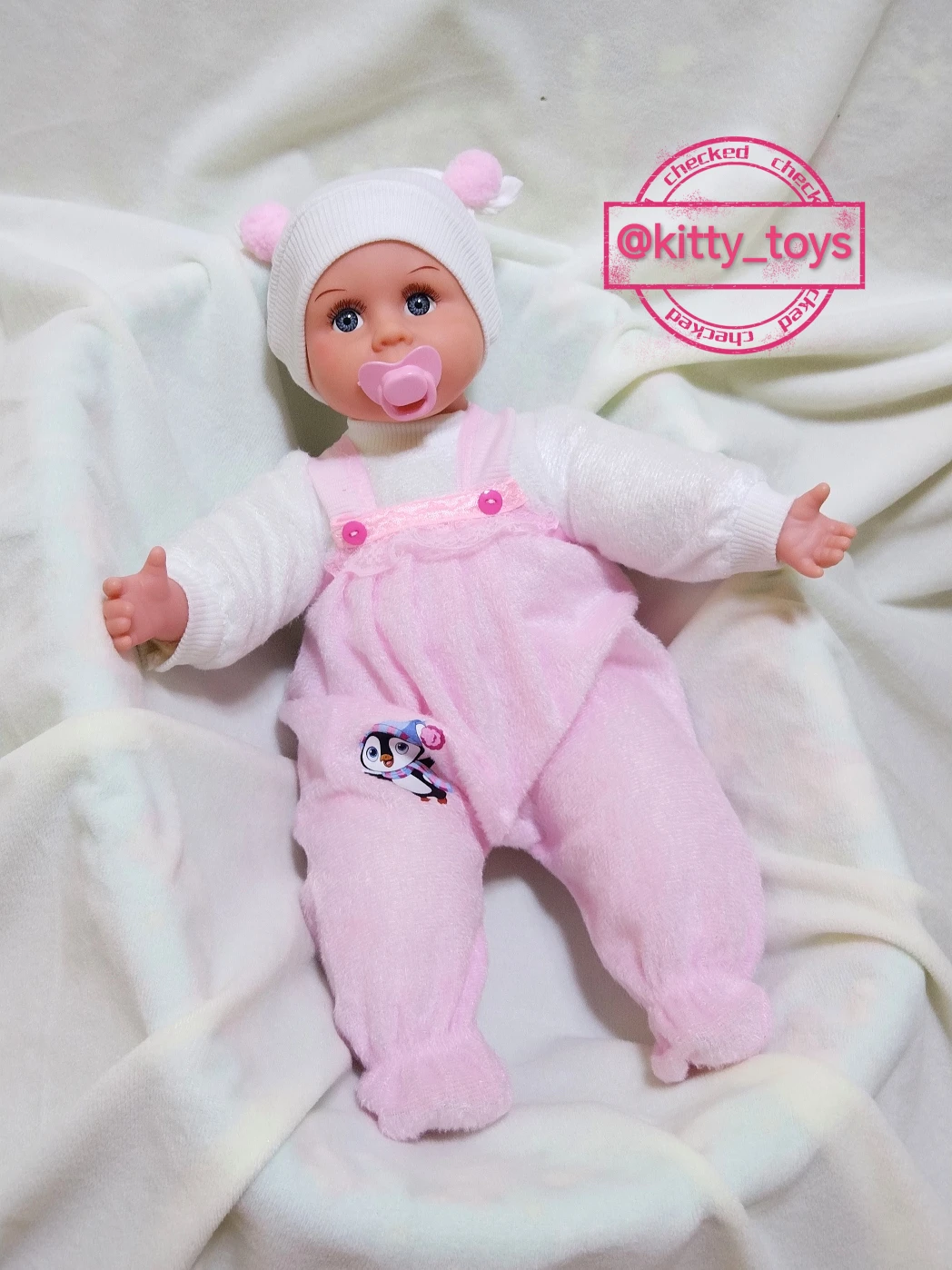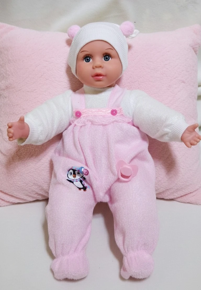 این عروسک قدی حدود 38 سانت دارد و جنس بدنش پنبه ای است. جنس صورت و دست و پاهای عروسک از قسمت مچ سیلیکونی بوده و ست لباسش شامل سرهمی، کلاه و بلوز است.