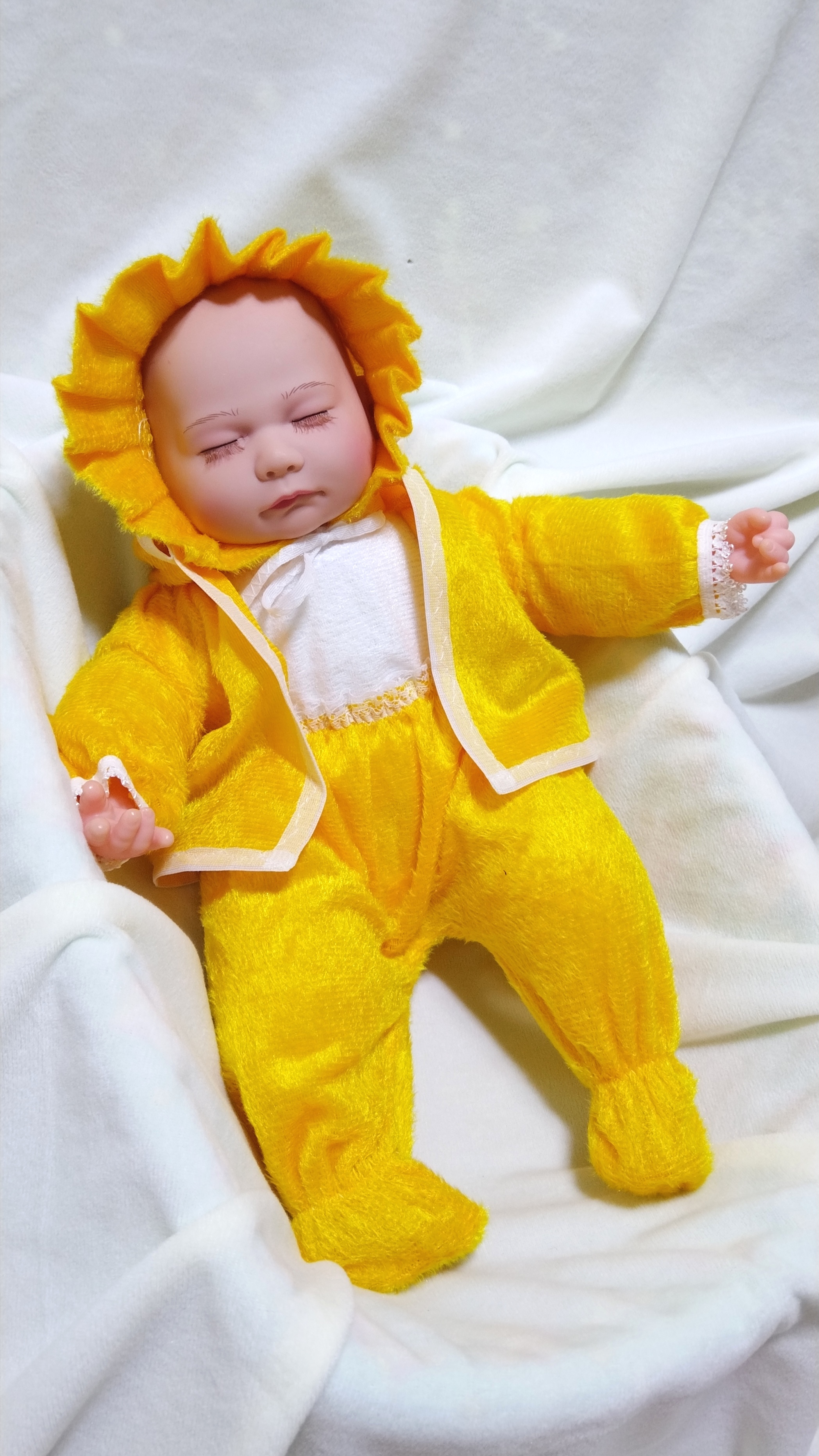 این محصول یک عروسک نوزاد زیبای بدن پنبه با قد حدود 38 سانت میباشد. جنس صورت و دست و پاهای عروسک از قسمت مچ سیلیکونی و بدنش پنبه است.